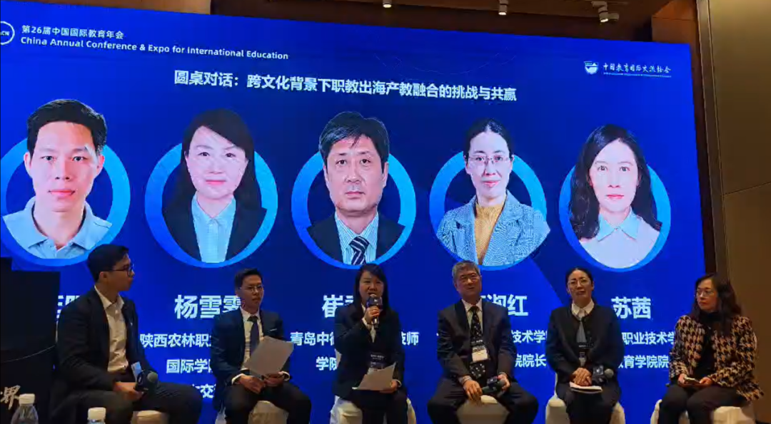 张家菁书记李云梅院长秦向阳总监?杨国宪教授在精彩的圆桌对话环节,越南歌尔工学院院长阮廷阳、陕西农林职业技术大学国际学院院长、国际合作交流处处长杨雪霁、青岛中德智能制造技师学院党委书记崔秀光、常州机电职业技术学院国际教育学院院长高淑红,以及广西机电职业技术学院国际教育学院院长苏茜,共同围绕“职教出海与跨国人才培养”展开深度讨论。