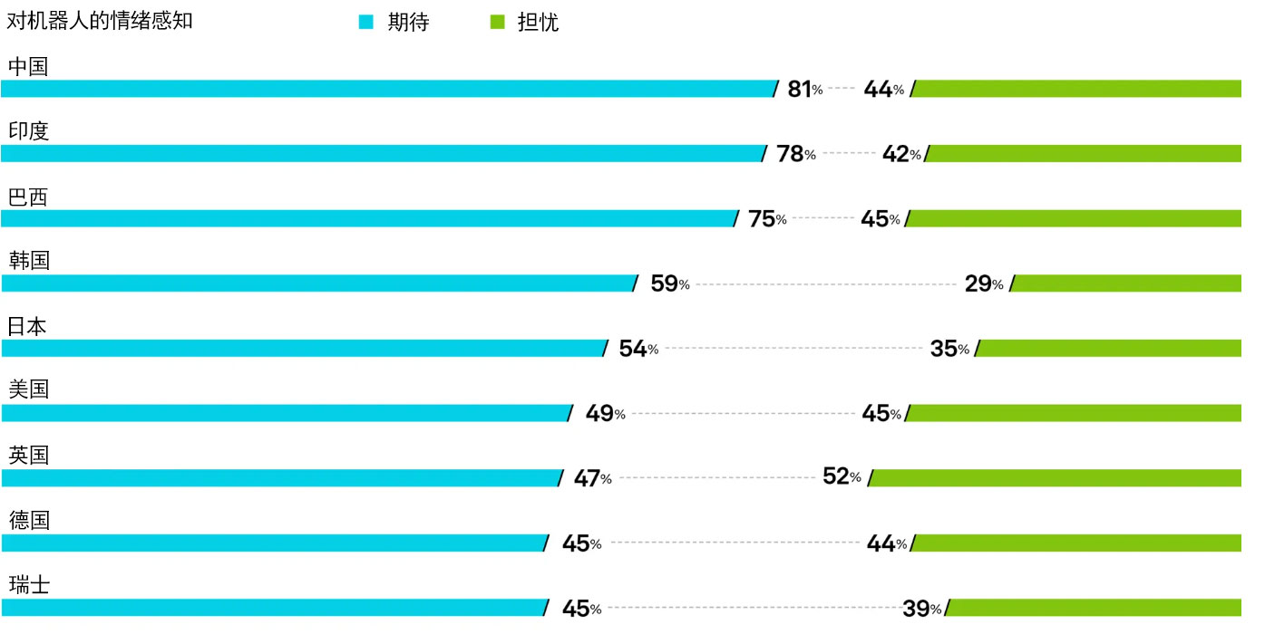 中国和韩国是全球机器人密度较高的国家之一,这也意味着两国在机器人应用进程中走在更前的位置。在这些市场中,更高的接触度带来了显著更低的担忧水平,以及更强烈的积极情绪与期待。